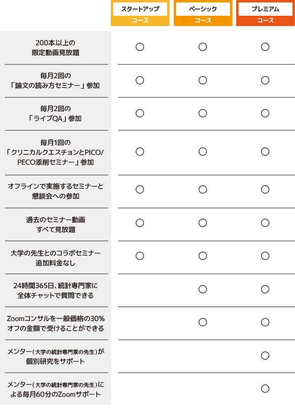弊社が運営する「いちばんやさしい医療統計大学校」では3コース用意しており、下記のようなサービスを提供しています。そのため、これから統計を学ぶ先生方にぴったりです。