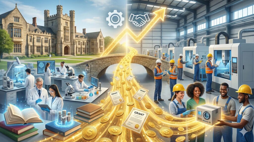 産学連携とは、企業(産)と大学・公的研究機関(学)が連携し、新しい技術や製品の開発を行うことです。国はこの取り組みを加速させるため、通常の中小企業向け補助金よりも上限金額が高く、補助率も有利な制度を数多く設けています。