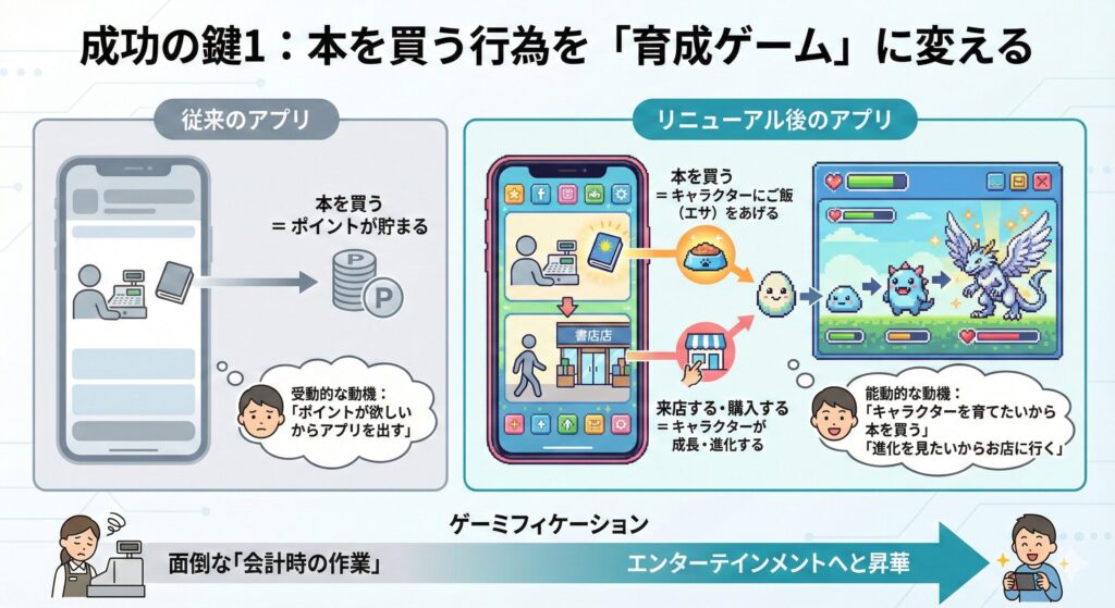 このように意味づけを変えることで、ユーザーの行動原理が変わります。 「ポイントが欲しいからアプリを出す」という受動的な動機から、「キャラクターを育てたいから本を買う」「進化を見たいからお店に行く」という能動的な動機へと変化するのです。